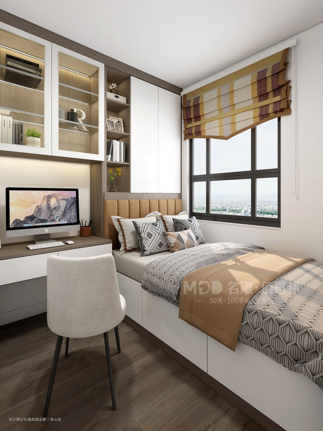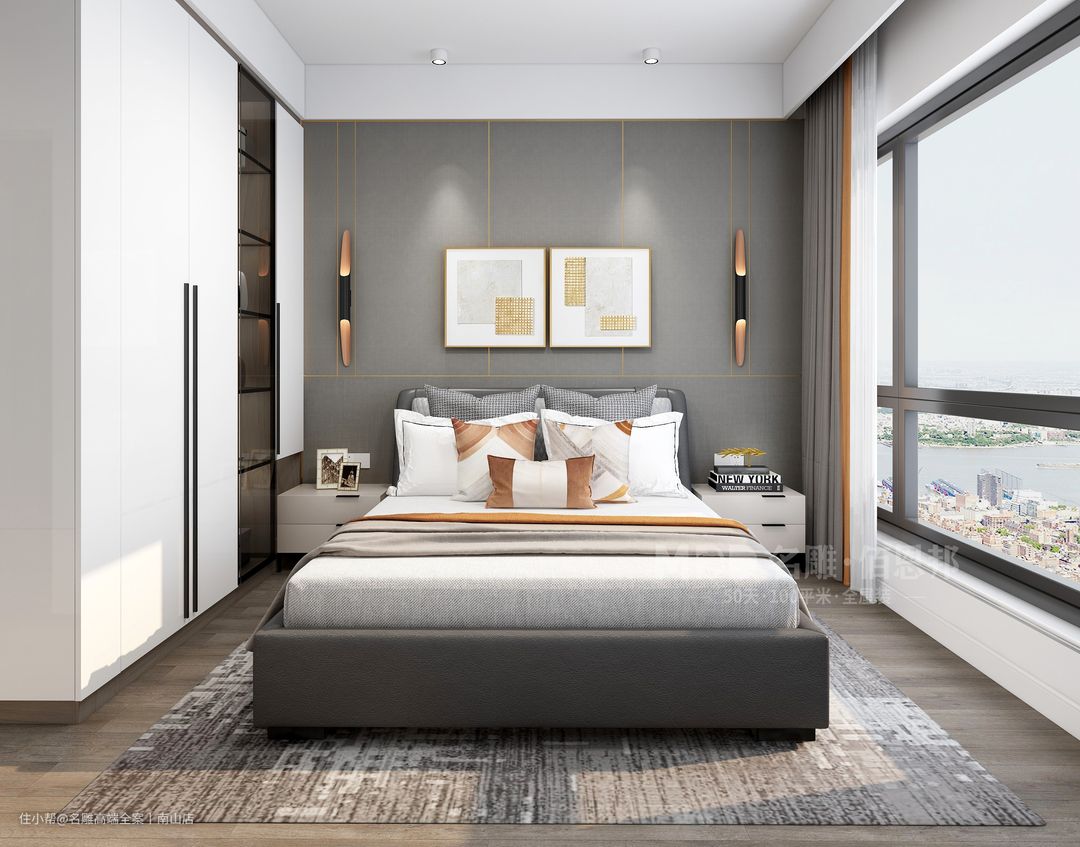 符合人体工程学设计的软包真皮床靠,创意背景墙,设计感十足的壁灯,富有艺术格调的装饰画,不论是配色还是材料都搭配有致的床品,这些都是全屋装可实现的项目哦,从整体出发设计,全屋实景落地,所见即所得。