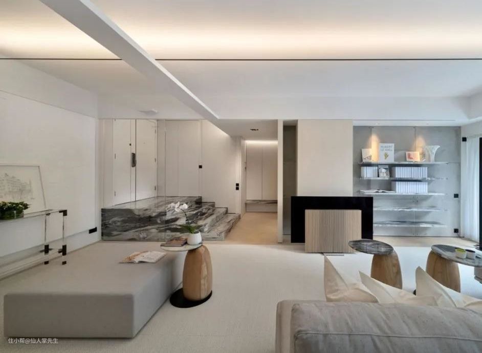 走廊对亮度的要求不高,可以用线性灯带代替传统的筒射灯。线性灯带作为走廊照明完全足够,可以满足穿脱鞋、放置取物的照明需求。而且线性灯带的灯光更加柔和高级,还能指引动线。