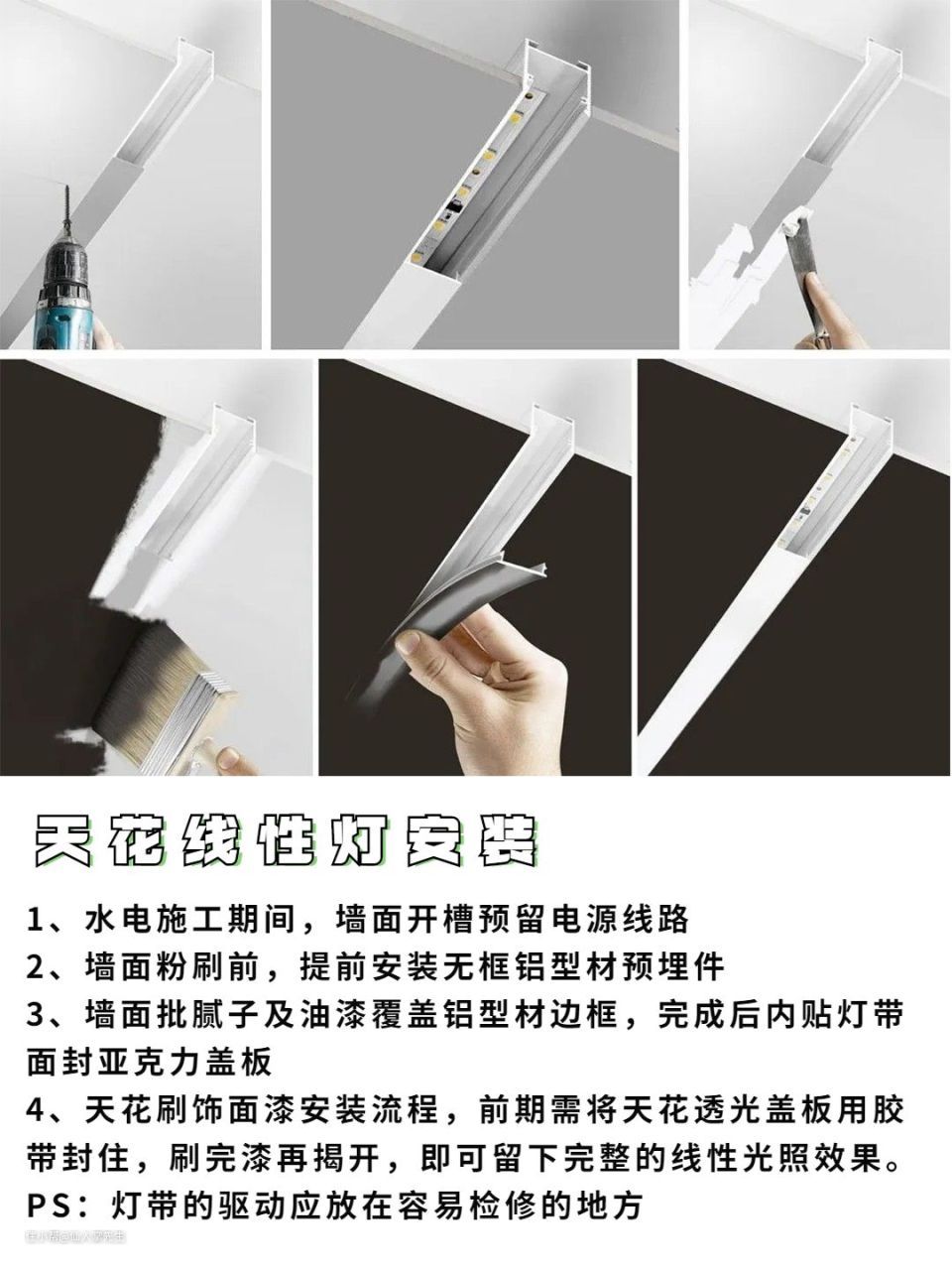 表面安装:表面安装的线性灯安装在天花或者墙体表面上,多适用于天花板高度导致吊灯太低的情况。