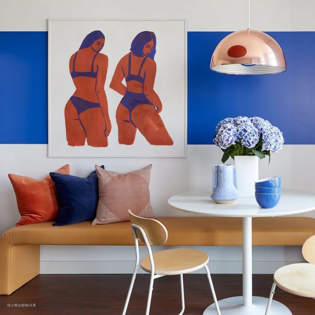 谁说克莱因蓝不能与浅色系搭配?只不过需要一些技巧。柔和的杏仁奶油白在视觉上压不住浓烈的克莱因蓝,因此,面积上缩小克莱因蓝所占的比例,或者把材质换成更容易搭配的布艺,这样搭出来的效果,就别有一番风味。