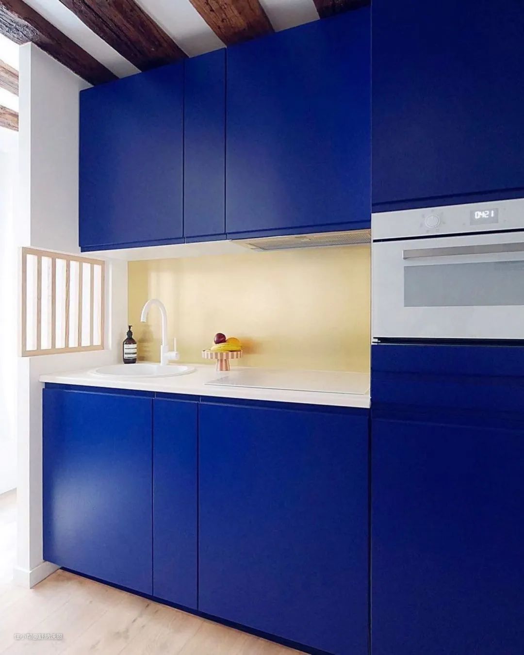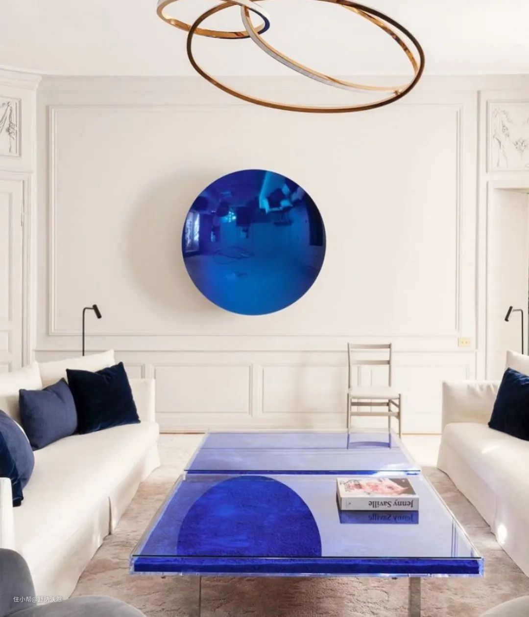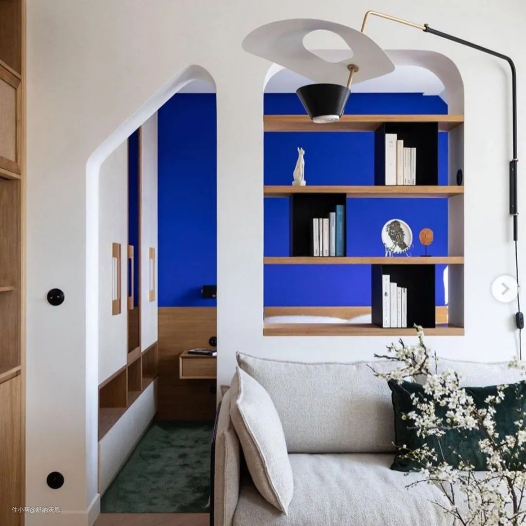 白色与克莱因蓝,可以说是最佳搭档,二者兼具纯净属性,属于无彩色的白能够柔化克莱因蓝带来的冲击感,在视觉上达到平衡,让空间看上去干净高级,格外清爽。