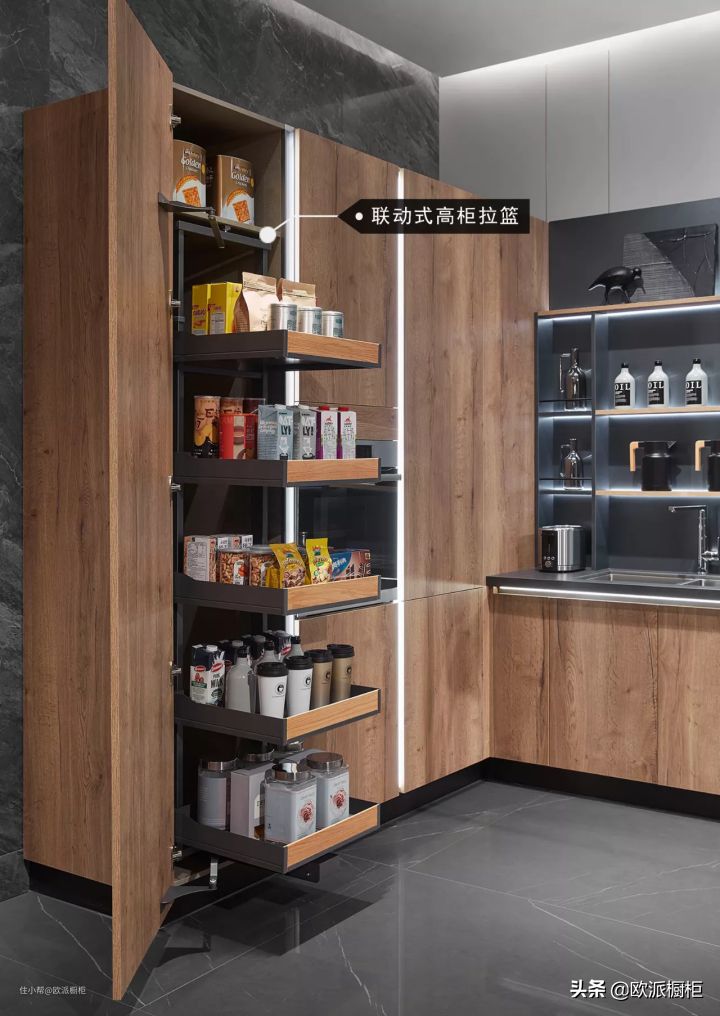 欧派橱柜班得瑞,采用原木色系的设计,让整个高柜自然质朴,线条流畅,低调又不失奢华。高柜带来超强储纳力,充分利用立体空间,高柜内部空间设有联动式拉篮,多层分隔栏,在高效储物的同时,让物品一览无余。