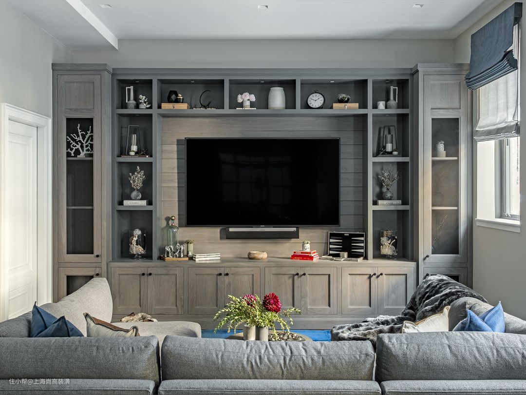 将电视放在墙上并用书架或艺术品围绕它可以帮助使房间更具凝聚力。为客厅选择单色调色板有助于您的电视融入其中。