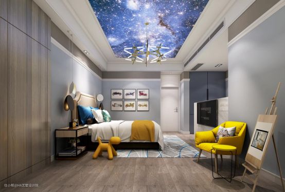 儿童房是客户提到的一个重点,设计师大胆对房间顶部布置了星空顶,链条式的灯具不显呆板,墙体主要由木色和浅灰色的拼接而成,加上橘黄色的休闲凳的撞色设计,整个儿童房活泼十足,动力四射。