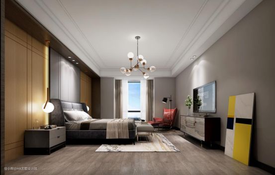 次卧的设计显得色调更加温和,做了满墙的柜子满足收纳需求,中间留有电视区,来了客人可以在床上看看电影,这里的灯具选择的是竖笛式的灯具,房间显得又美了一番。