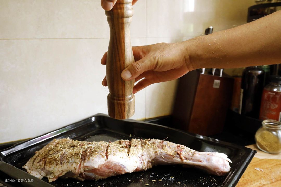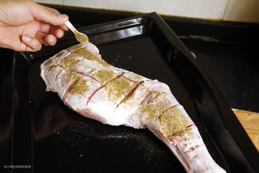 佐料正反面都撒上,然后给羊腿做一个马杀鸡。