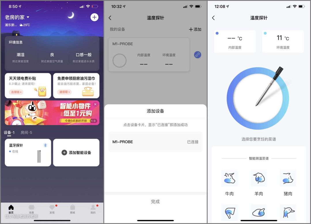 下载“美的美居”APP,点击添加蓝牙探针,即可自动找出并识别当前的温度探针,如有多个探针可以一并在此页面显示,方便管理。