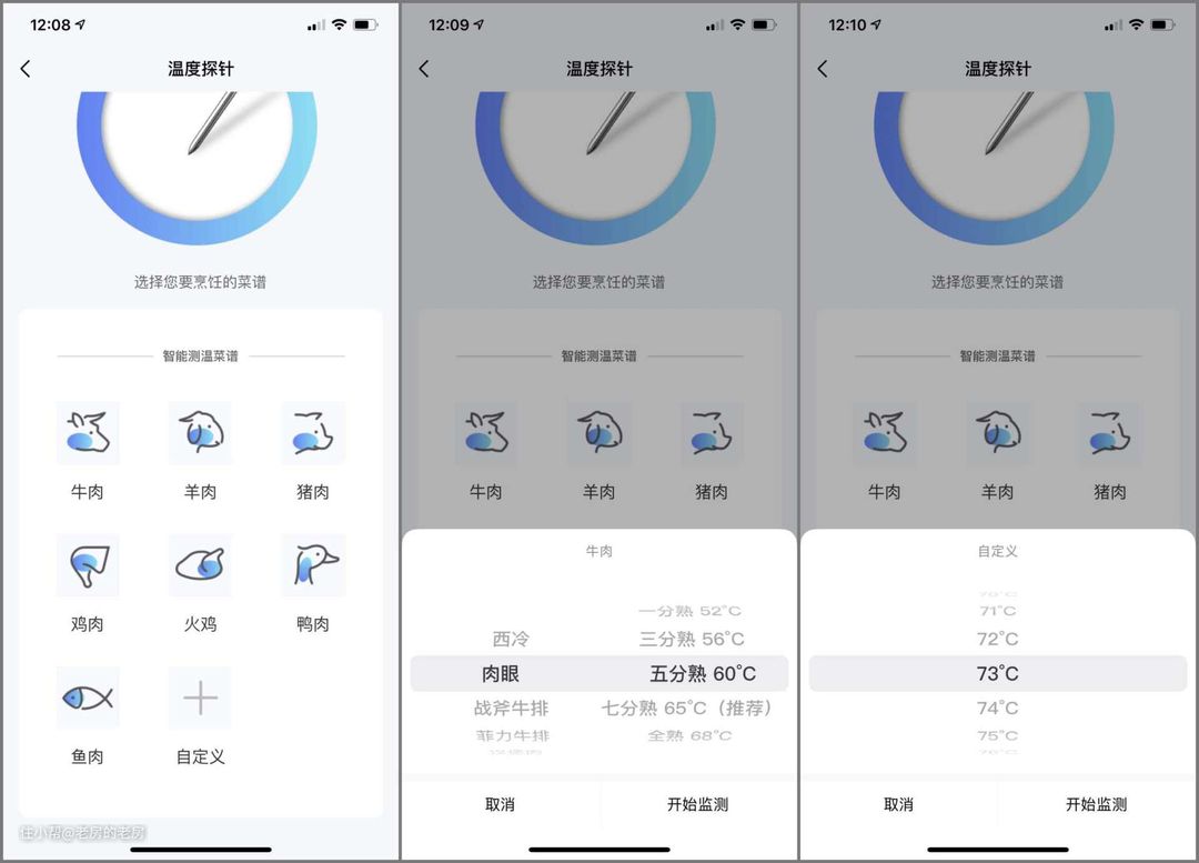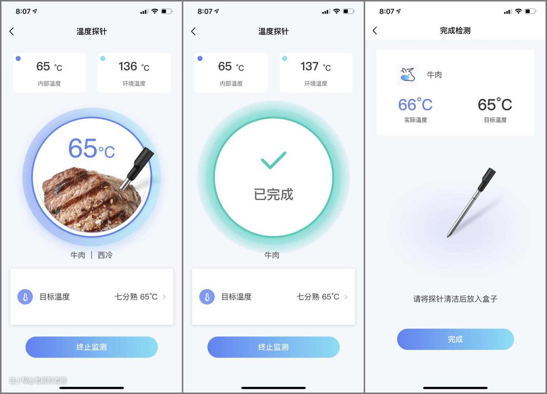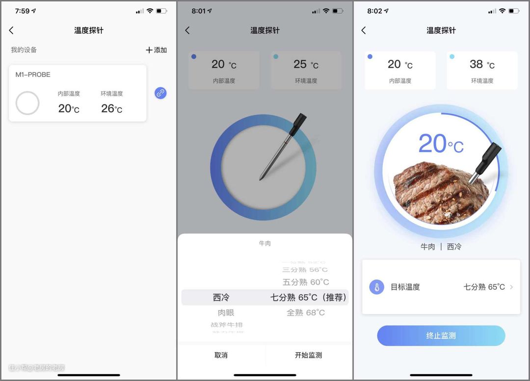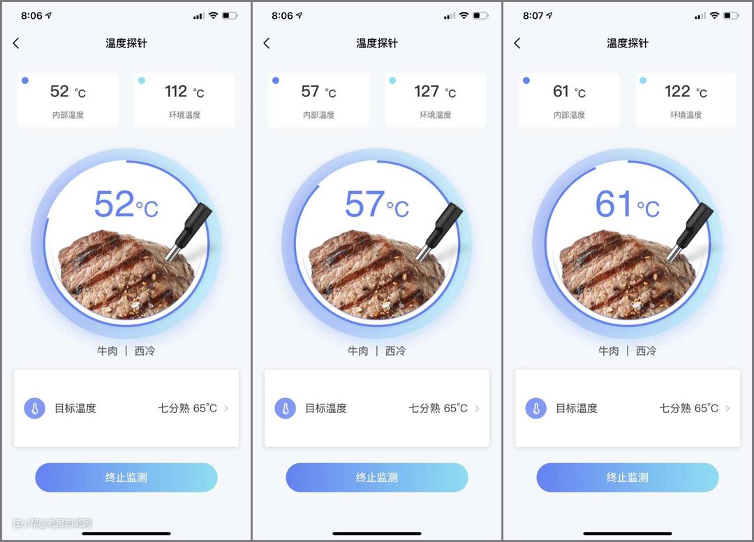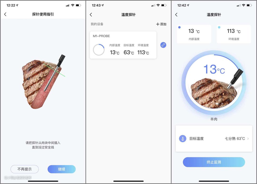 温度探针的出现就完全解决了这个问题,不用“望闻问切”,不用“掐指一算”,烤肉、煎肉之前直接插进去就行,温度到了就提醒,不需要凭经验瞎猜,还能做出最精确的肉食。
