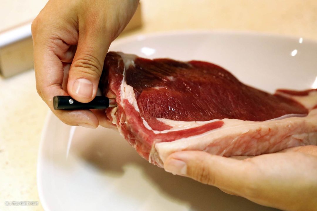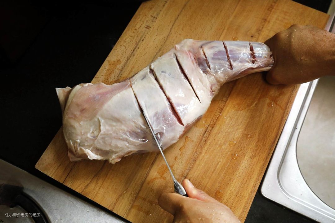 宁夏滩羊,带骨前腿。烹制之前,先用刀咔嚓咔嚓正反面划上几刀,更容易入味更容易熟。