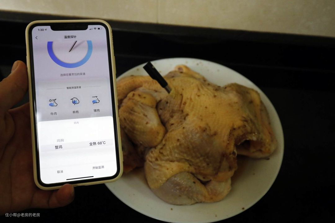烹饪之前,插入美的智能探针,推荐斜着对准肉厚的地方插进去,APP 中设置整鸡全熟。