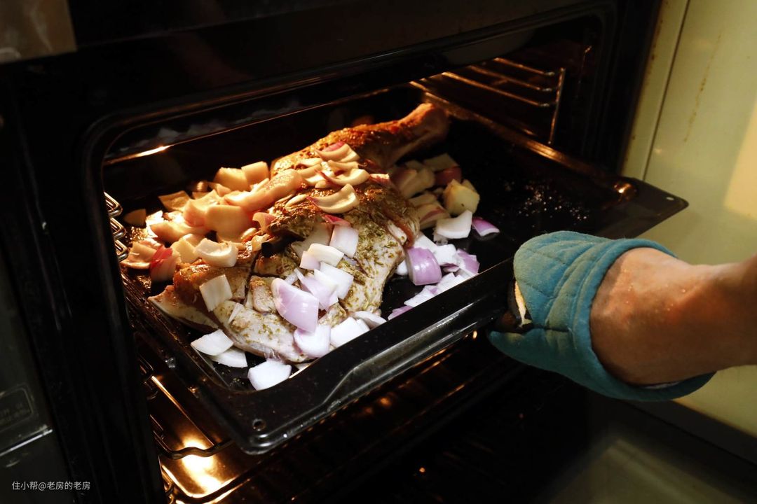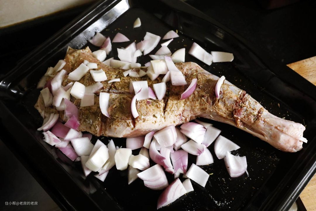 烤箱设置上下 200 度,预热 10 分钟,然后放入腌制好的羊腿。