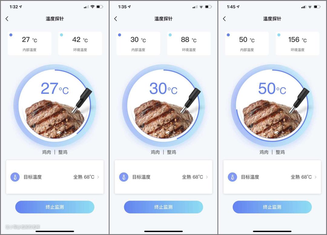 其次是蓝牙无线连接手机,实时监测温度并显示在手机上,远距离监控,解放双手,完全不影响烹饪过程,也避免了被烫伤的风险。