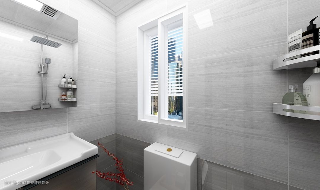 卫生间灰色墙面砖的空间,装上一个白色的洗手盆,还有具有收纳力的镜柜,整个空间显得实用优雅而时尚。