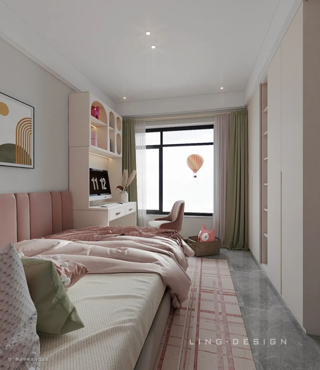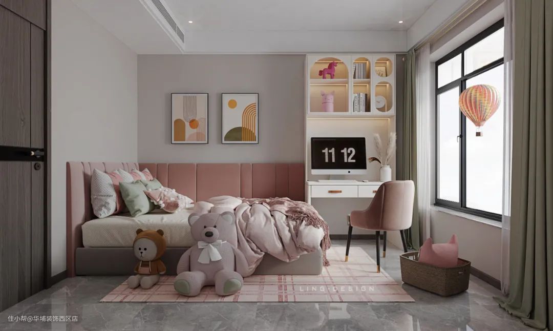 儿童房不只是一个空间,更是一段独一无二的时光,是承载整个童年回忆的地方。本案儿童房采用明亮淡雅的色彩,米咖色与芭比粉于空间交织,让孩子们的心情也跟着晴朗。