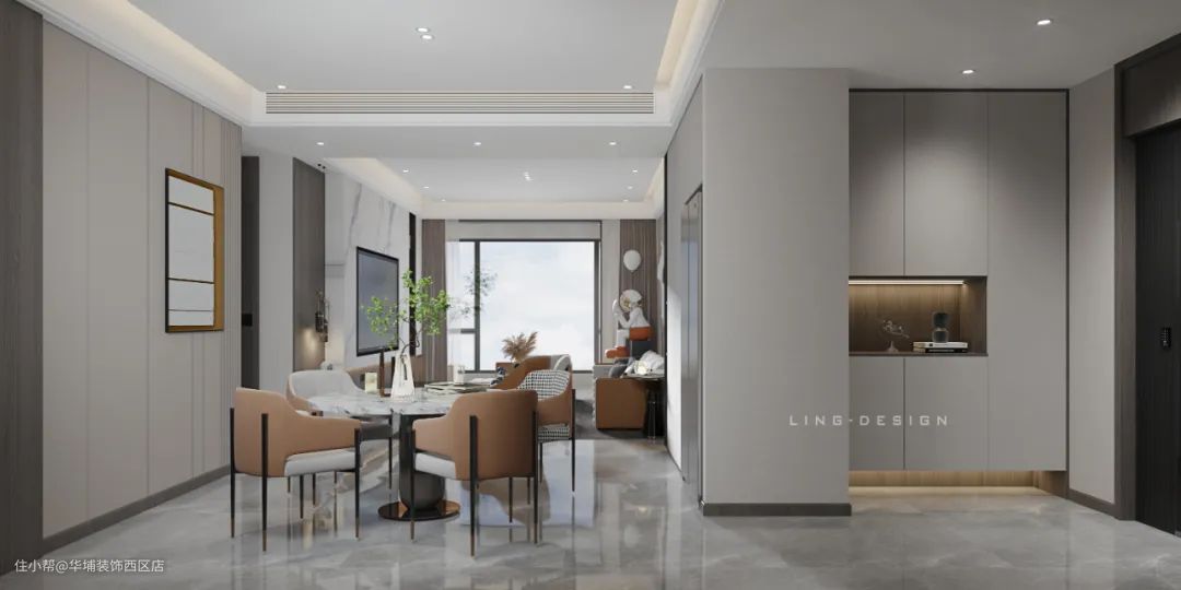 本案以现代风格定义整个空间,米咖色与木饰面碰撞,没有跳脱的色彩,没有过多的矫饰,适量的留白塑造出简约时尚的艺术美感,一切都恰到好处。