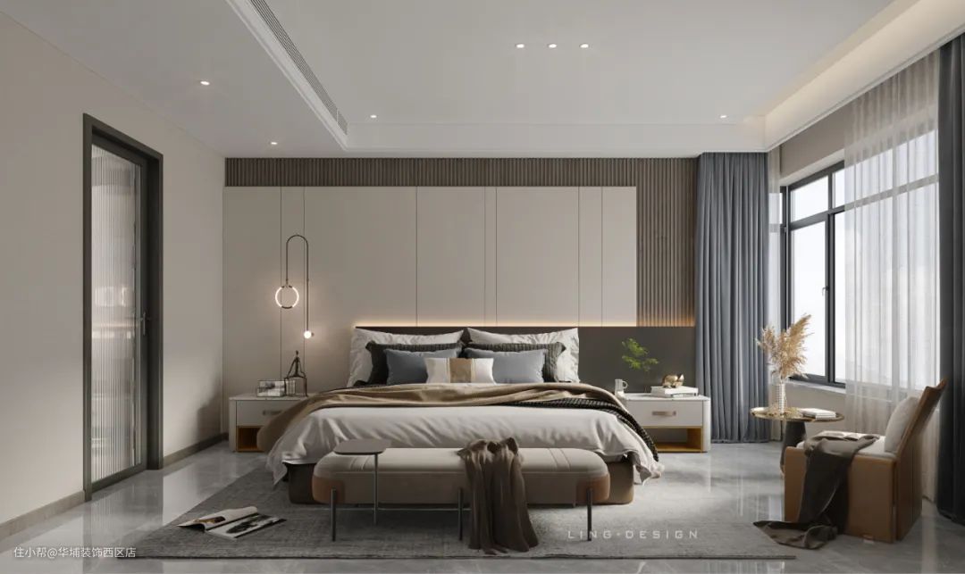卧室选用米咖色作为主色调,木饰面局部点缀,奠定了沉静优雅的空间气质。整个房间注重美和形式感,硬包、墙板打造独特的床头背景,富有层次的无主灯设计,舒适柔软的床品,使整个居室更富有生活情感,彰显主人的品味与格调。