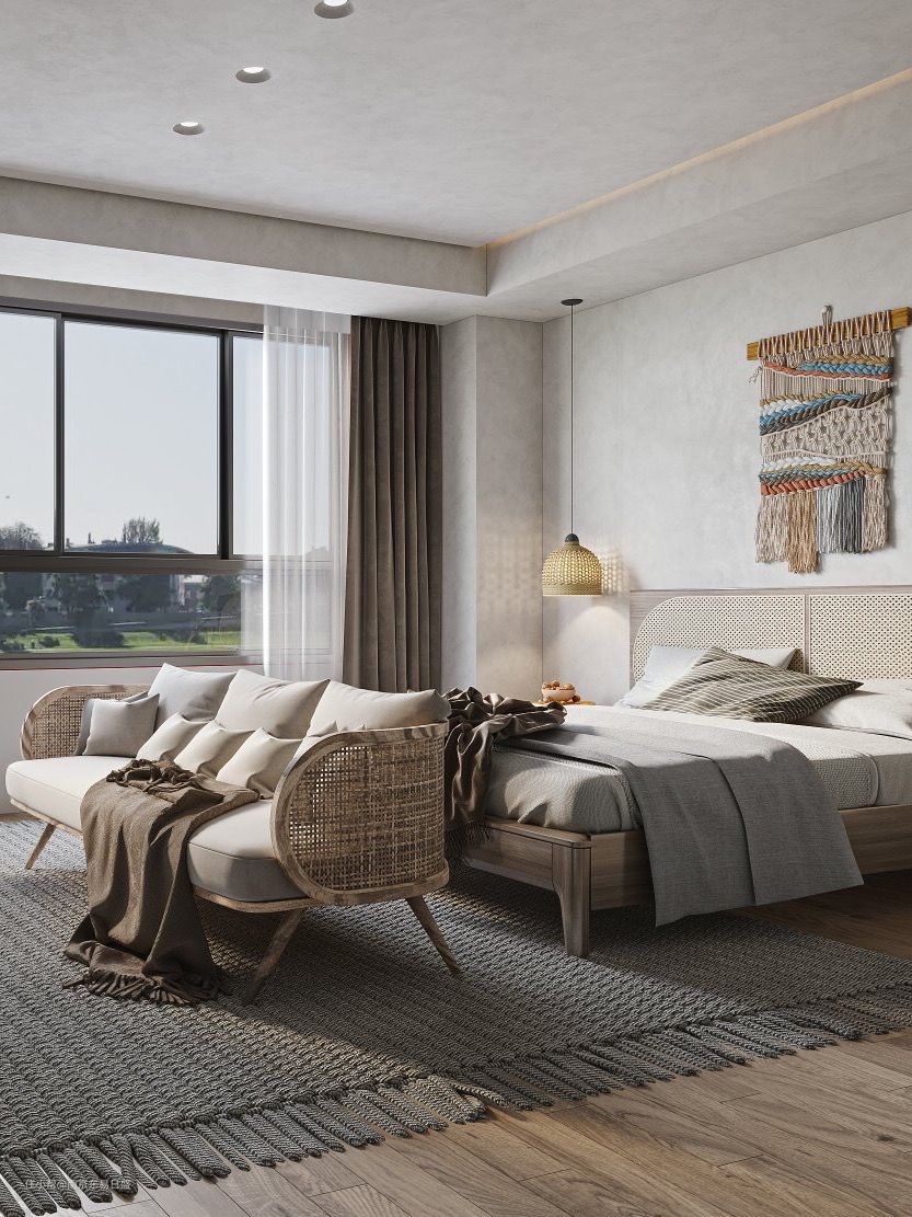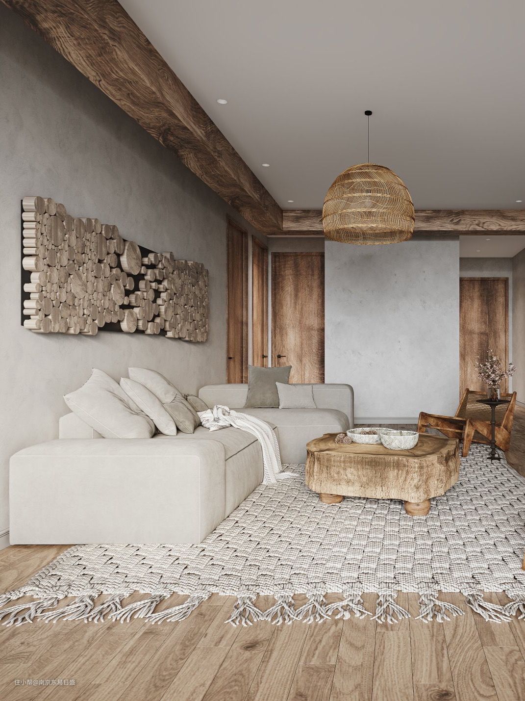 原木纹吊顶与手工编制的地毯省去了花哨繁杂的感知,更加突出侘寂的不均整、简朴、孤高、自然、幽玄、超凡脱俗、寂静这七大原则。