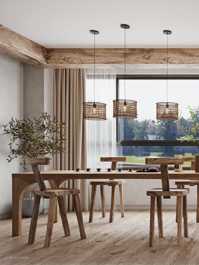 细长的木制桌椅别具美感,让空间更加轻盈。编制灯具与周围的环境非常契合,适当的绿植点缀于如此朴实清雅的空间,间接带出了一些生命的活力,淡雅舒适中内蕴生活的芳华。