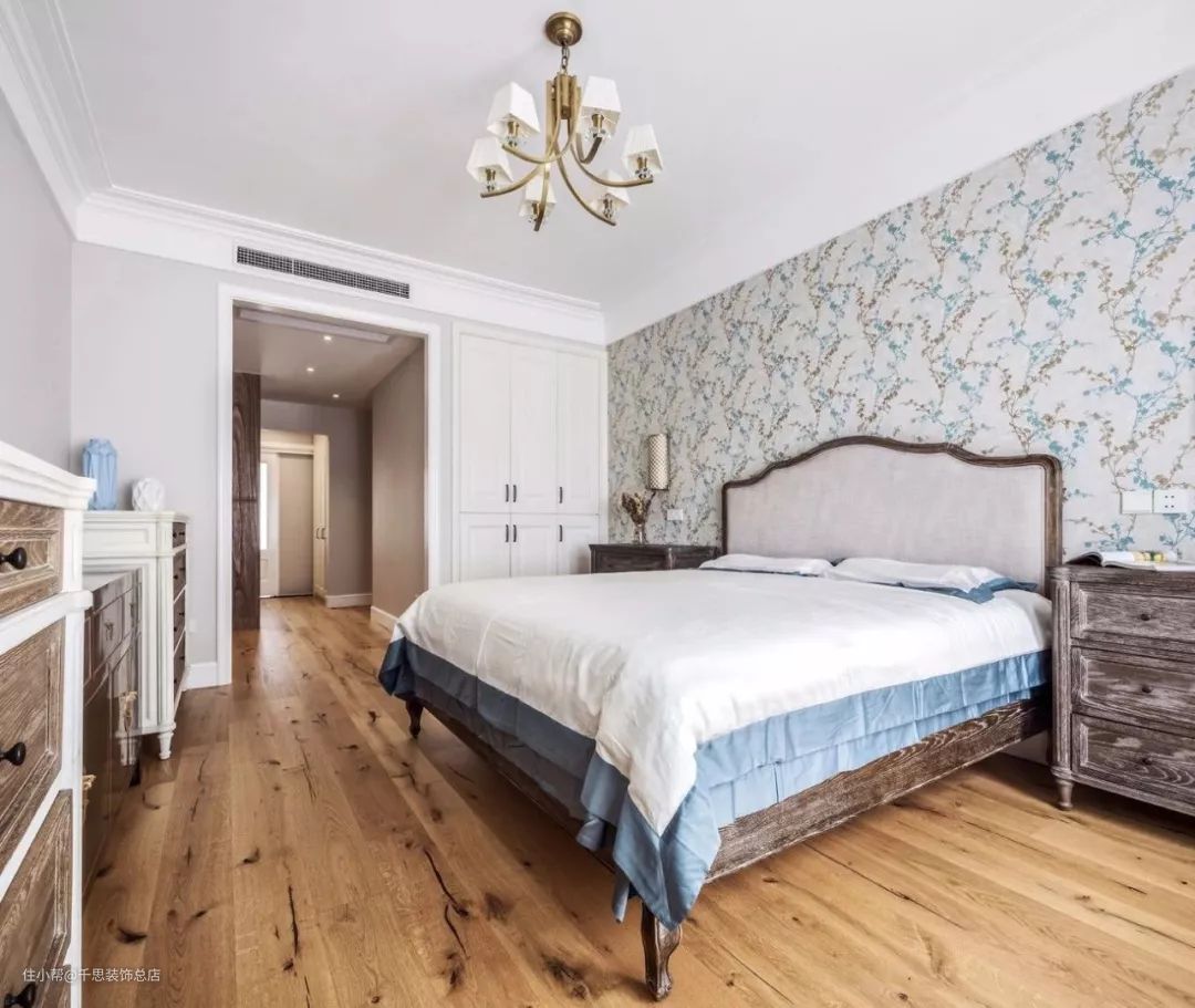 很多业主会把入墙式柜子设计在床的一侧,窗户在一侧或者在床尾的方向,这样摆放让卧室更通透。