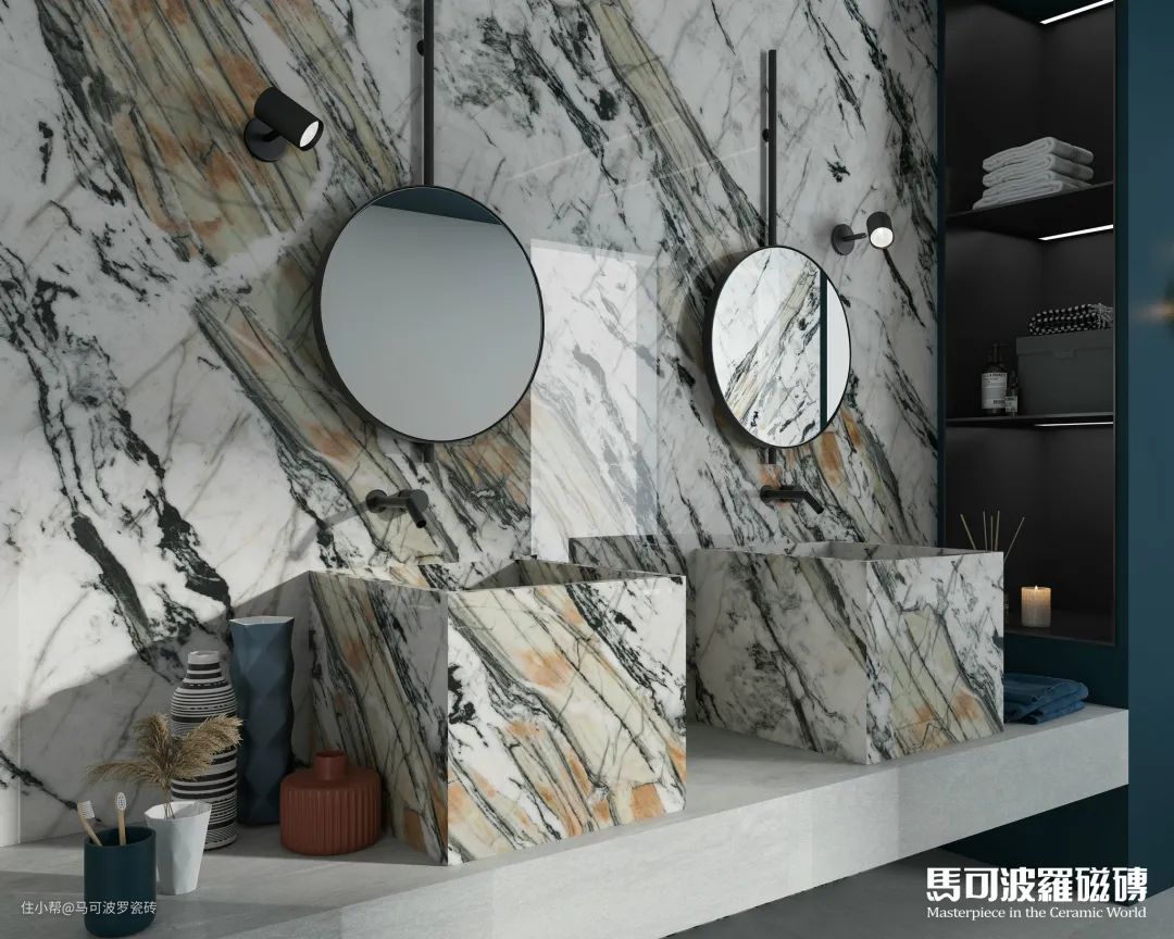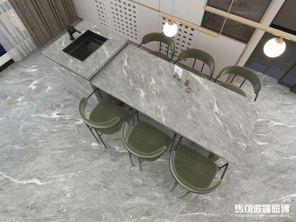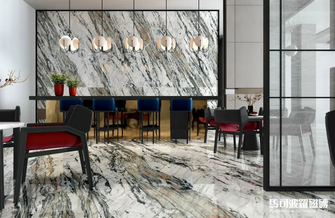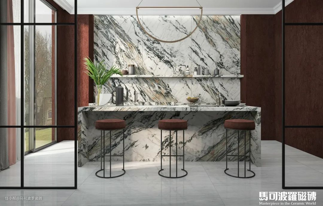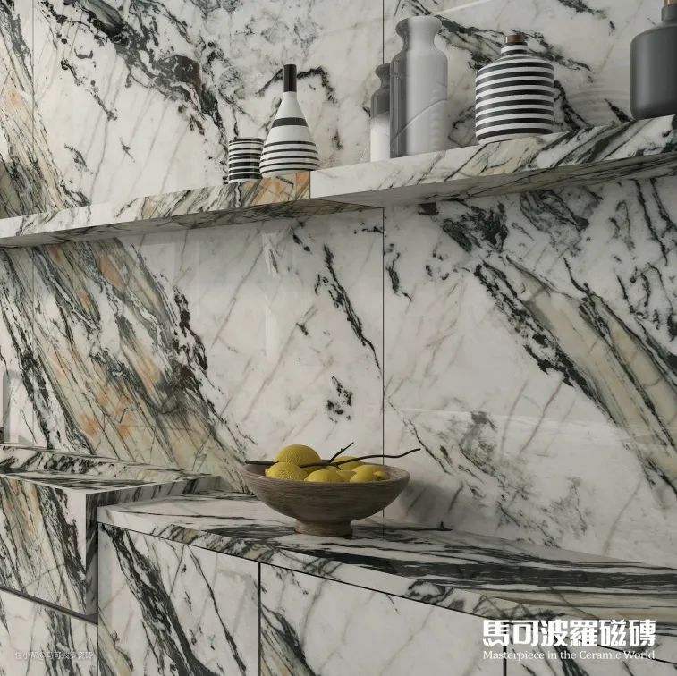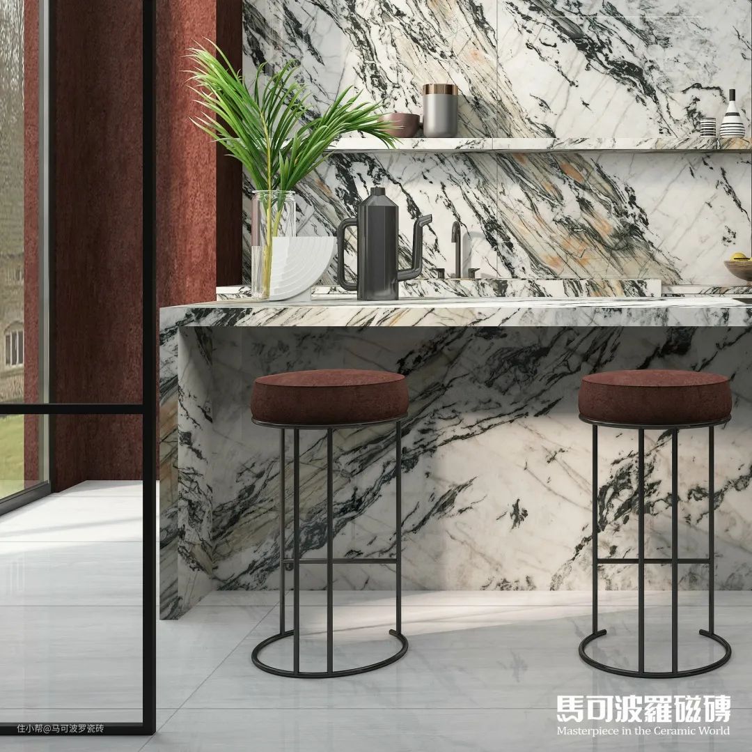 目前,马可波罗瓷砖共推出两片对纹、多片连纹、AI随机无限连纹等多种连纹类型,包含1600×3200、1200×2400、800×2400、900×1800mm等多种规格,满足不同空间、不同功能运用,既能“上墙下地”,也可应用于桌面、橱柜等创意铺贴及建筑外墙等户外领域。