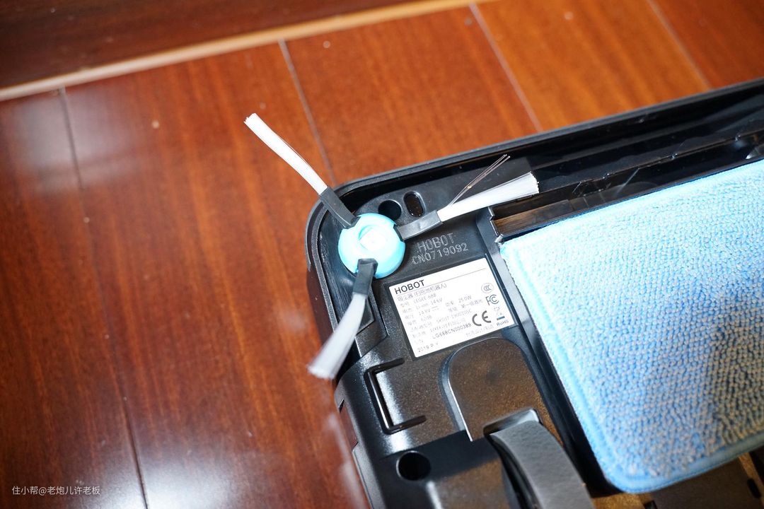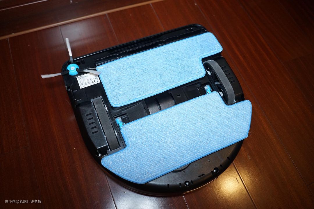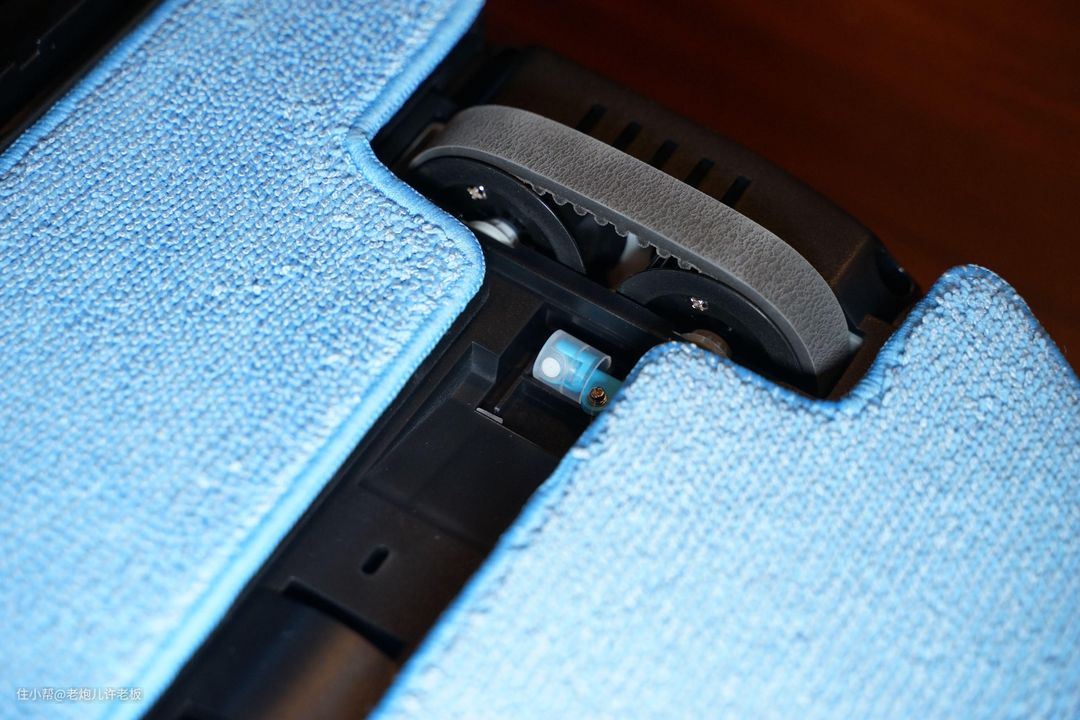玻妞雷姬LEGEE-688的底盘设计上采用单边刷、吸尘口、双抹布干湿擦和中央喷水一体式清扫方案。机器在清扫过程中,前后双抹布会用每秒10下的方式前后擦拭,这让这台有着与一般二合一扫地机完全不同等级的拖地效果,而履带式的设计是避免打滑,但也因此不像一般使用大颗动力轮的扫地机器人,并不具备越障能力,另外在最前方位置有两个防坠落的感应器。