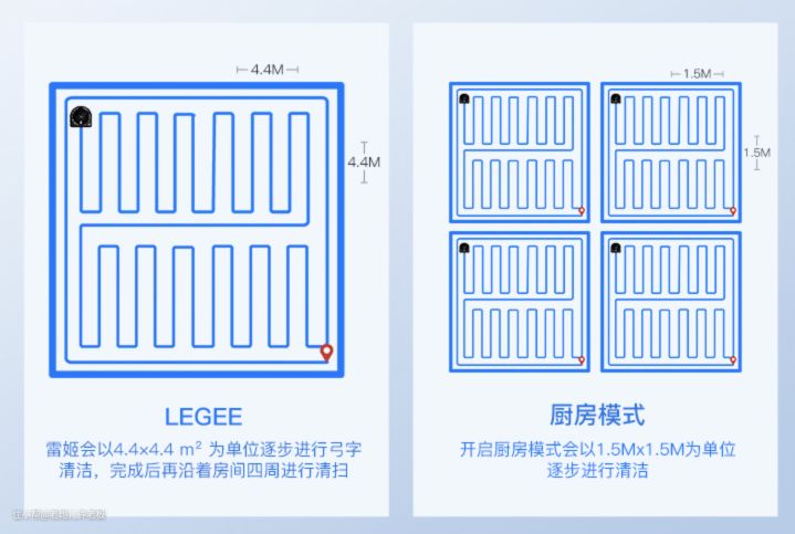 玻妞雷姬LEGEE-688的行走模式为将空间以4.4m*4.4m为单位切成多个方块相继处理,而在厨房这类空间中,开启厨房模式后会以1.5m*1.5m为单位逐步进行清洁。
