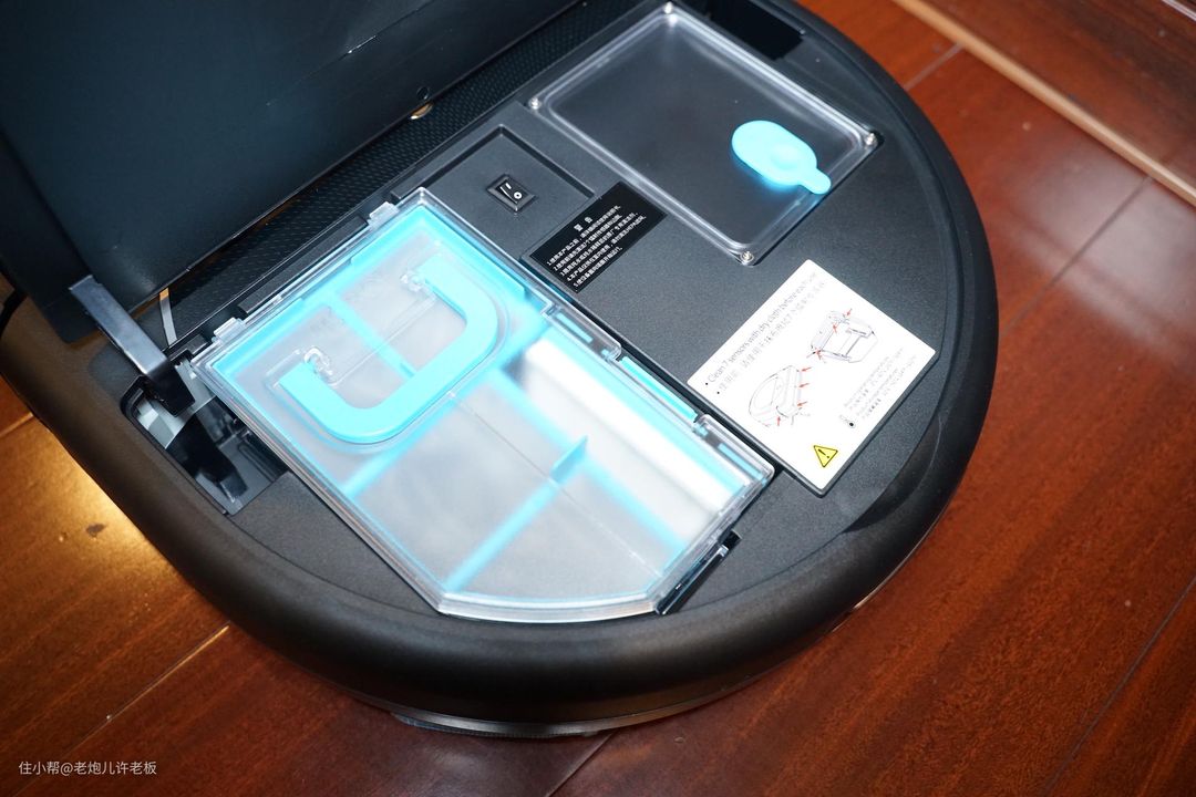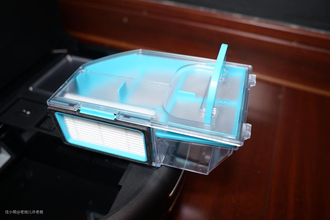 打开机身的盖子,可以看到集尘盒和水箱,其中集尘盒容量为0.5L,水箱为0.32L。集尘盒上方是一个把手,侧方是前置滤网。