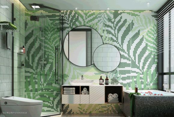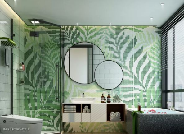 1号浴室用彩色小方砖“绘制”成的背景墙,让人仿佛走进了丛林中一般,充满活力,心情愉悦。