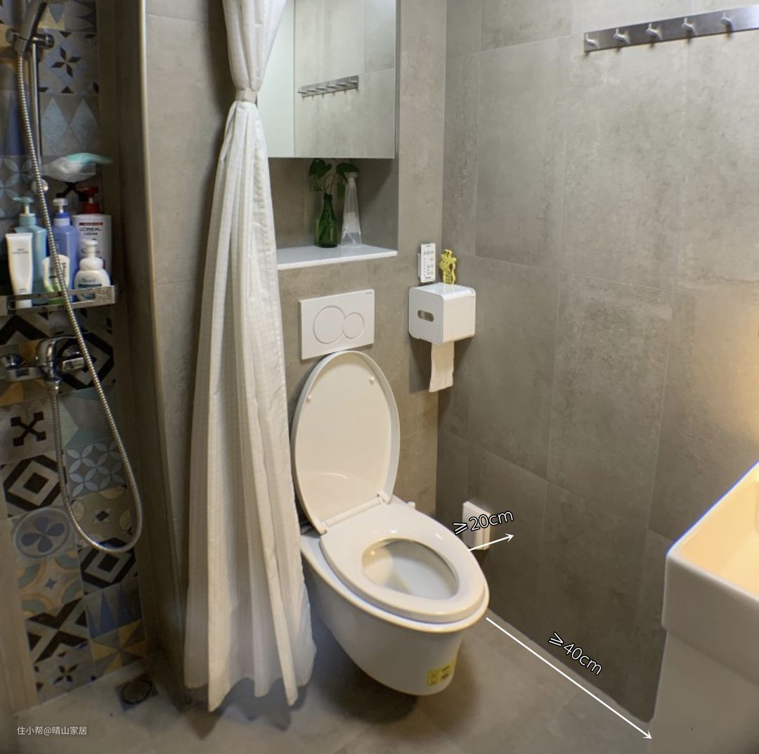 马桶一般都在角落的位置,但是尺寸不预留好的话,要么太窄坐着非常拥挤,要么太宽浪费空间。