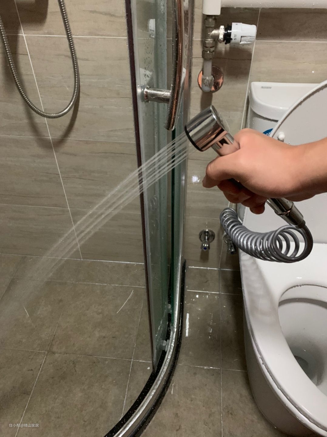 但装了淋浴隔断的话,最好装上高压喷枪,位置选择马桶和淋浴区中间,除了方便冲洗马桶之外,淋浴房玻璃、地面、墙面等位置,都能照顾到。
