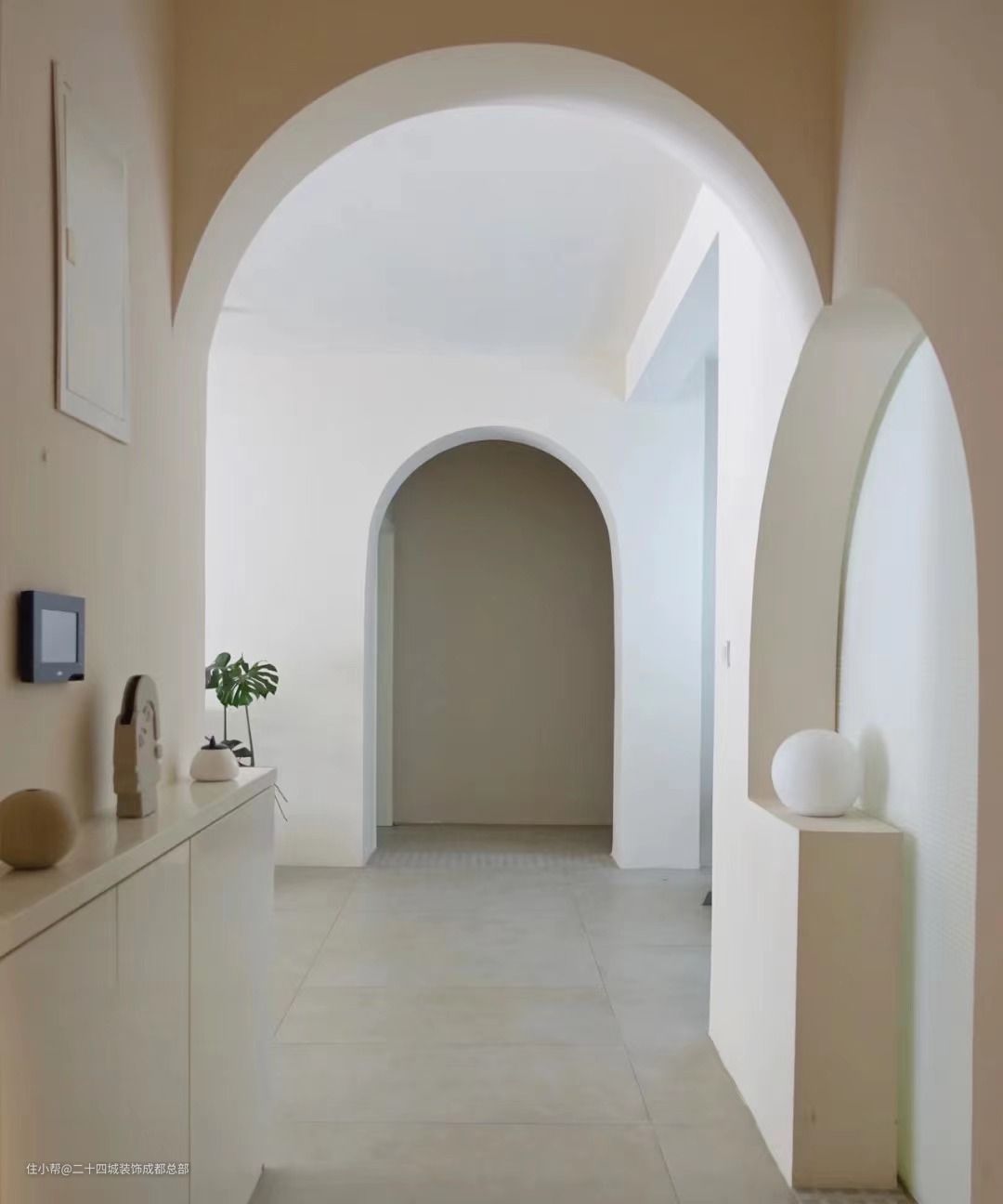 设计了2个拱门,把房门尺寸敲得大一点,和走道的拱门尺寸接近,在视觉上有高低错落感,无需考虑隔音功能,故没有做门,只是选了蜂巢帘做遮挡,这房子的层高真的太适合拱门了,效果特别好。