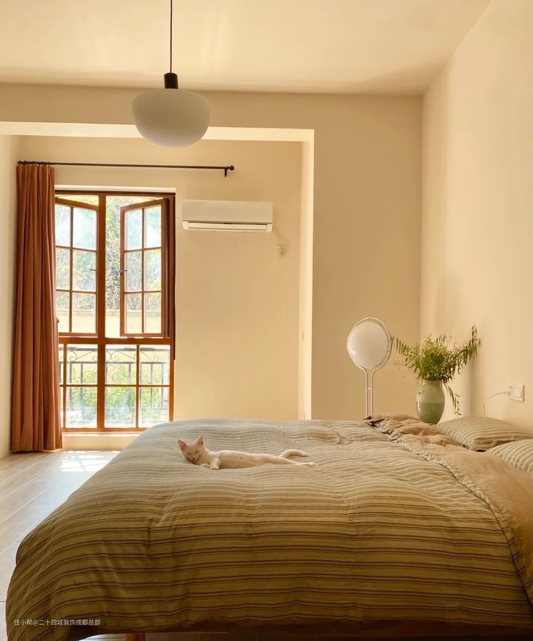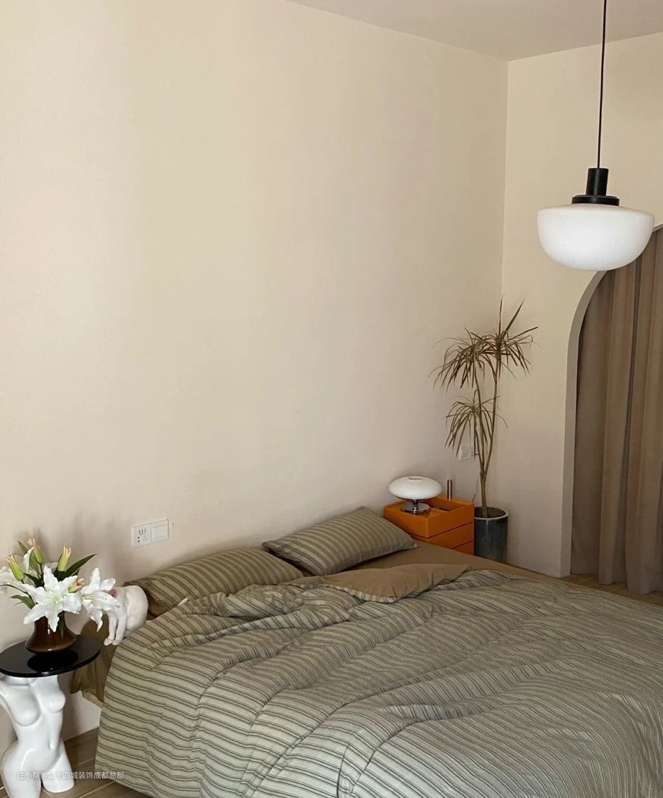 整个卧室除了衣帽间的拱门,其他没有任何造型,油漆选了非常淡的奶油色通刷,让空间更加显大,有安静温暖的感觉。