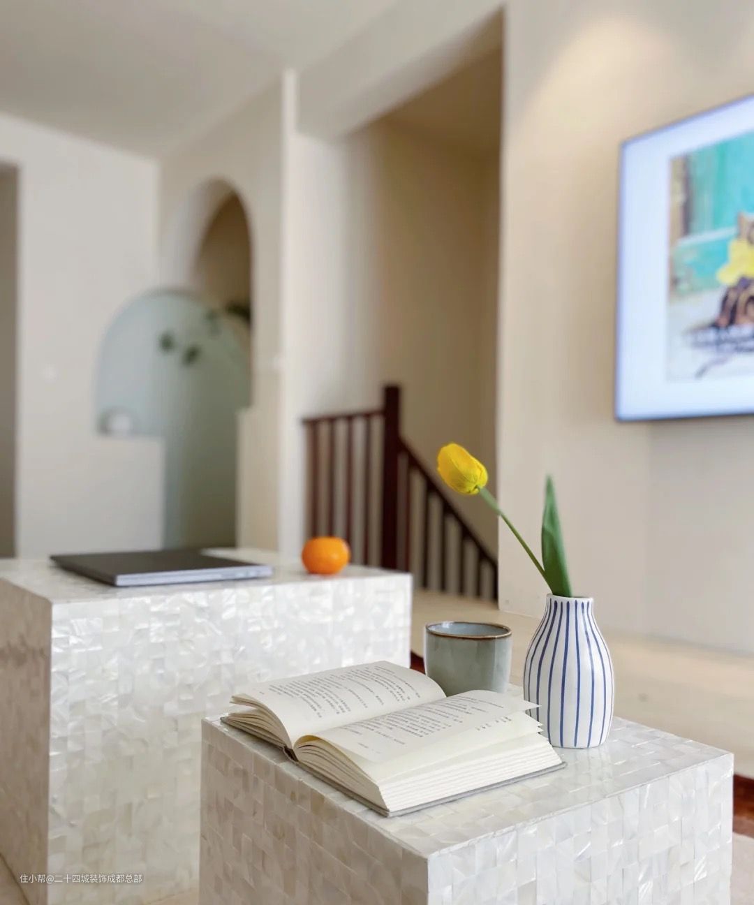 这个茶几是现场做的,木工师傅打好基础后,拿贝壳马赛克贴的装饰面,用补色膏补下缝,简直美上天,拍照绝了。