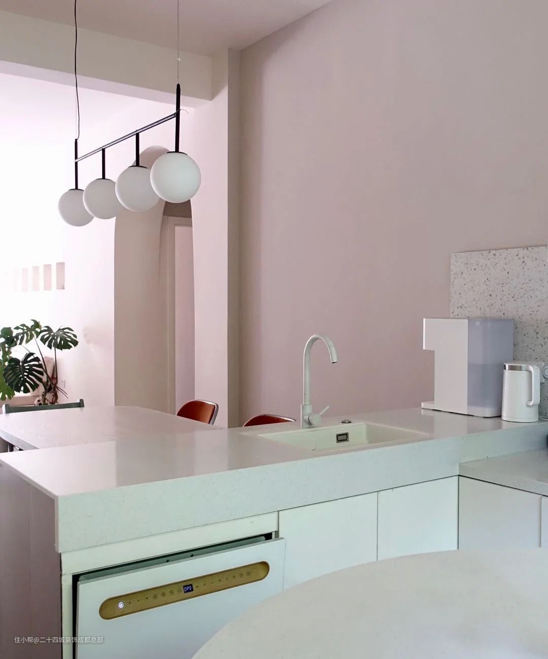 女主表示也不想要吊柜,考虑到厨房的整体实用性,操作台和收纳空间不能少,做了圆形岛台,虽然跟u形比起来少一些台面和储物,但圆形岛台更省空间,也让厨房的动线更为流畅。