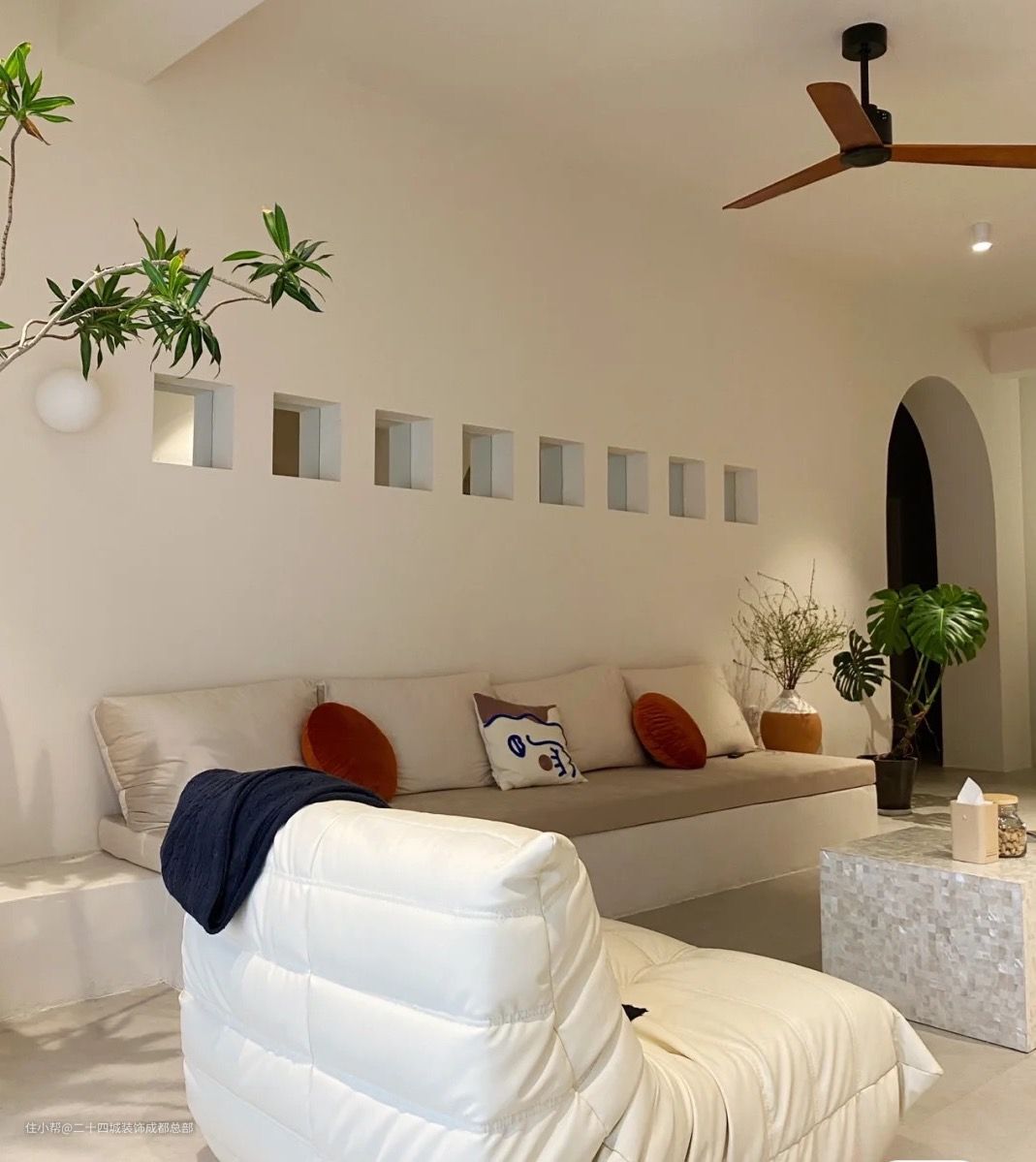 无吊顶,所有的线路都是墙体开槽,明装灯和壁挂空调,大沙发是水泥砌砖,外面刷乳胶漆,沙发垫和靠枕都是定做的,一排格子壁龛不是墙体上凿出来的,而是用石膏板在实体墙上做的造型,内嵌镜子。