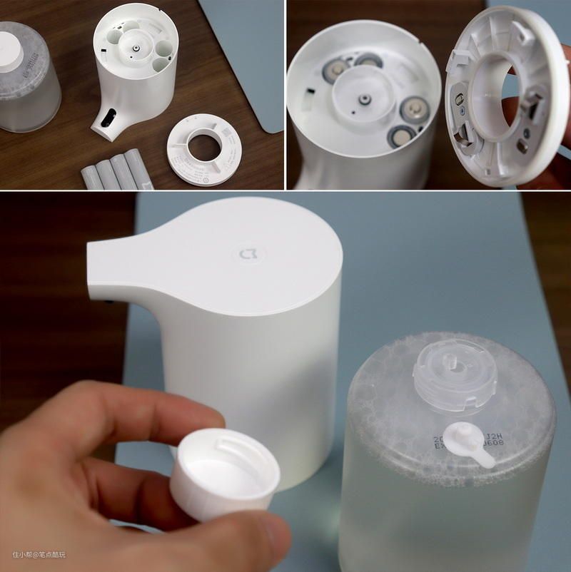 电池安装需要从底部拧开洗手机仓门,放入电池要注意正负极别装反,2正2反装好再装回仓门,此后拧开洗手液瓶盖、取下硅胶封闭塞,再将洗手机、洗手液瓶身上下连接,旋转固定好,就组装完成了。