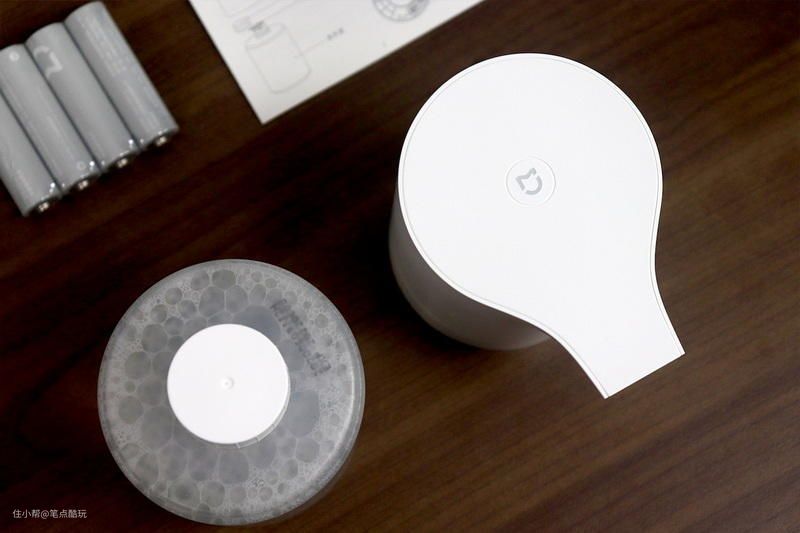 洗手机顶部为平面,简洁的线条一眼难忘,说不出的好看。顶部正中央的米家LOGO也是一枚开关键,启动/暂停出泡,点它一下就行,还会通过白/黄双色亮起/闪烁来提示启动状态。