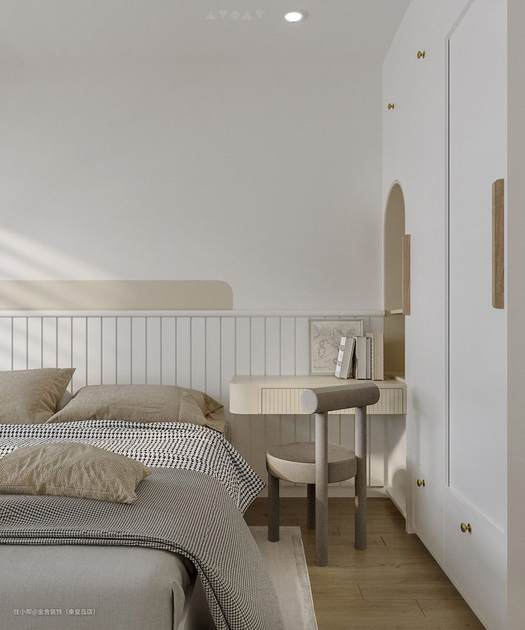 白色衣柜与拱形嵌件形成鲜明对比。