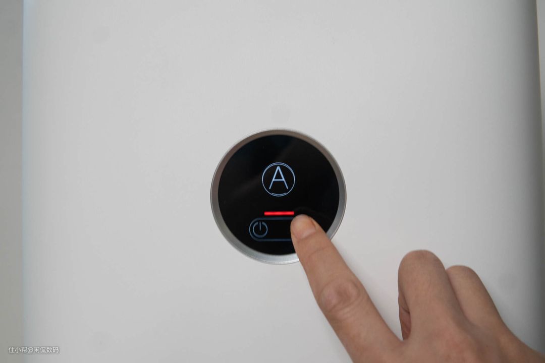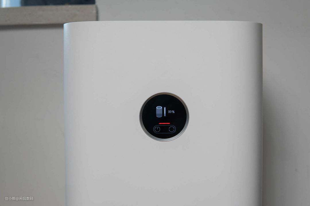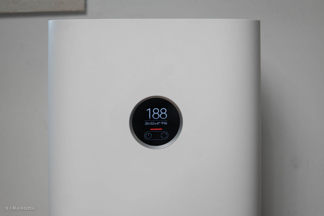 在净化器的正面有个OLED屏幕既可以显示信息,也可以作为触控操作区域,主要显示内容为实时的PM2.5数据和档位,如果你对PM2.5的数值不是很敏感的话,还有不同颜色的指示灯来提示现在房间空气的情况,如果是红色就说明室内空气比较糟糕,属于重度污染,如果是橙色说明室内空气有点差,属于中轻度污染,如果是绿色说明室内空气处于比较好的状态。