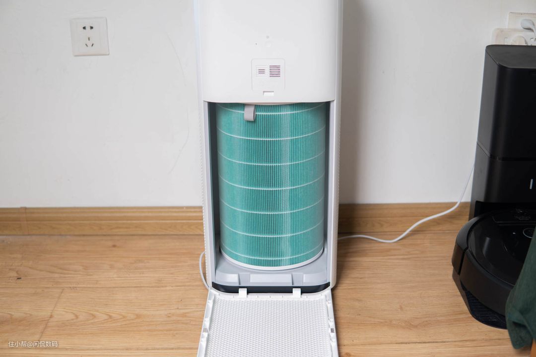米家空气净化器4 Pro在细节设计上也有升级,顶部格栅采用了可拆卸的设计,翻开顶部这个小盖子可以用螺丝刀把顶部格栅拆下来,可以很方便的清洁扇叶和风道,避免二次污染。我也专门问过为什么要用螺丝固定而不是直接拆卸,主要的考虑是防止宝宝误开个格栅触碰到扇叶导致受伤,有个螺丝固定会安全不少。更换滤芯的仓门是磁吸式的设计,打开比较方便。