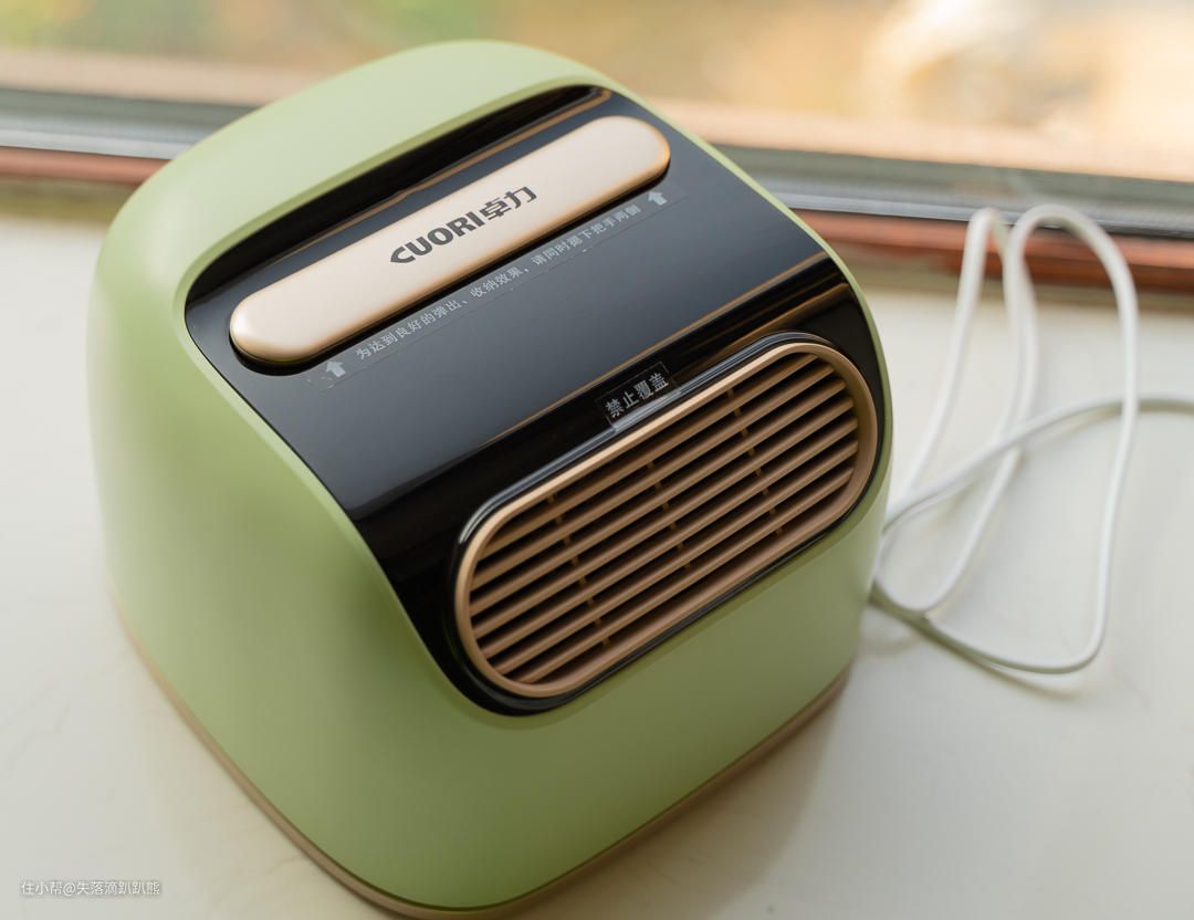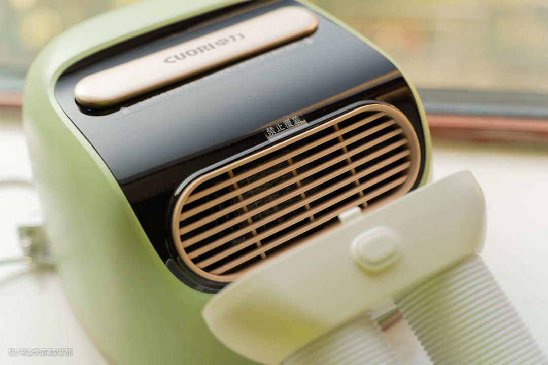 卓力多功能烘干机采用莫兰迪绿和黑色相间的外壳,搭配金色的出风口、提手和底座,机身小巧精致设计感足...