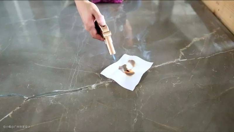 其次是要去“烧”。岩板是经过超高温烧制而成的,不惧明火。这时可以取一块岩板样本放在明火上烧,好的岩板是不会燃烧、不会开裂、不会变黑的。