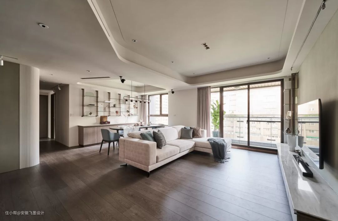 所以这个设计你们就完全可以学习了,给两个开放式功能区的墙顶上方,安装不规则的异形吊顶,客厅一边做根据空间大小做稍大的环绕式弧形吊顶,另一边根据小餐厅的面积,设计较小的吊顶设计,内部再嵌入灯带,平时把灯打开,自然划分两边空间,实用至极。