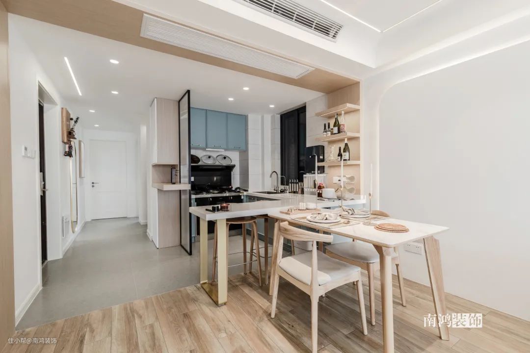 同理,可将餐桌与岛台结合,岛台既可提供储藏空间,又可拓展操作台,相当实用!