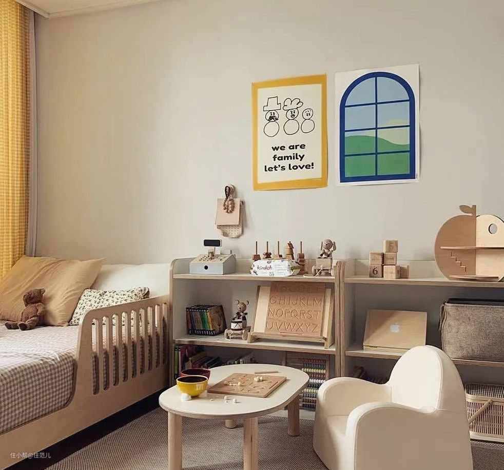可以把孩子客厅的活动区放到儿童房,构成独立的玩耍空间,也为分房睡做铺垫。