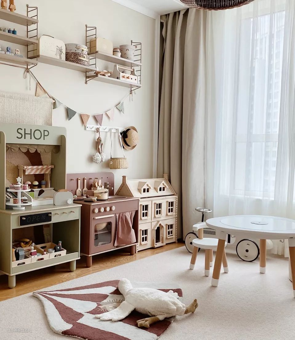 准备床+书桌+书架+玩具+矮柜子,孩子除了玩还可以写写画画,为上学打基础。