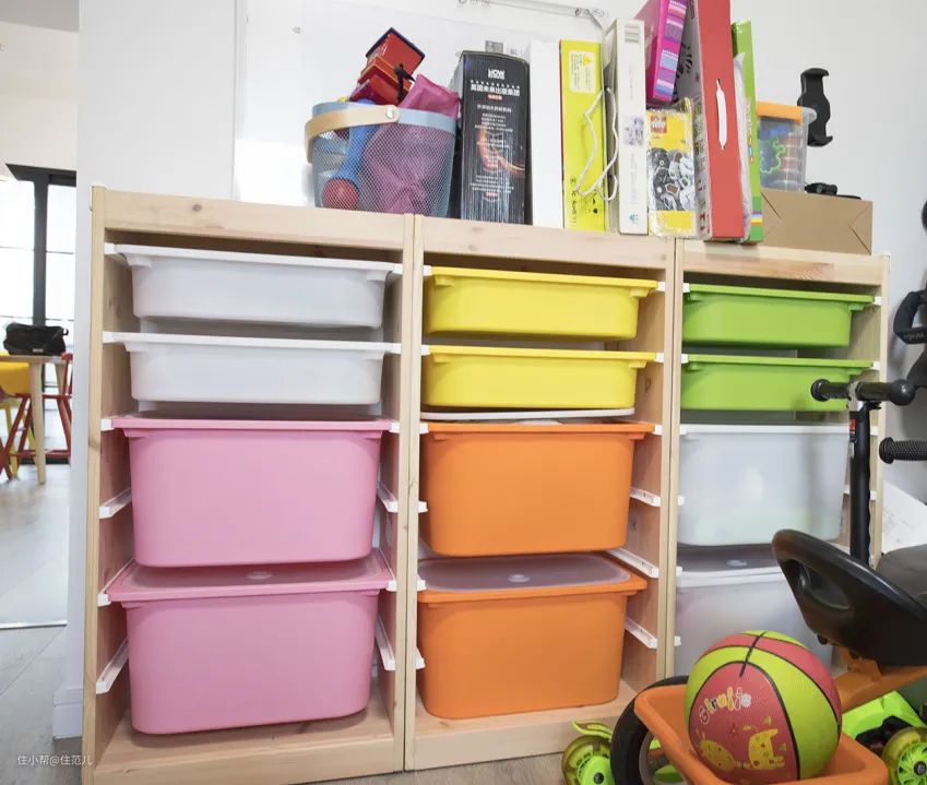 儿童物品的特点是“小而杂”,所以收纳的时候,可参考之前写过的测评网红收纳法当中的“立体集成收纳法和二八收纳法”。