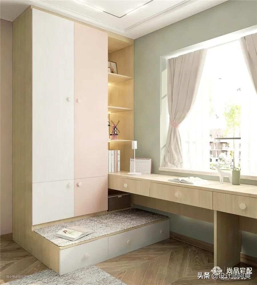 ▲飘窗阅读角+超薄绘本收纳柜,满足姐妹读书的爱好。白板贴+镜子公共区紧挨着阅读角,方便姐妹交流小秘密。