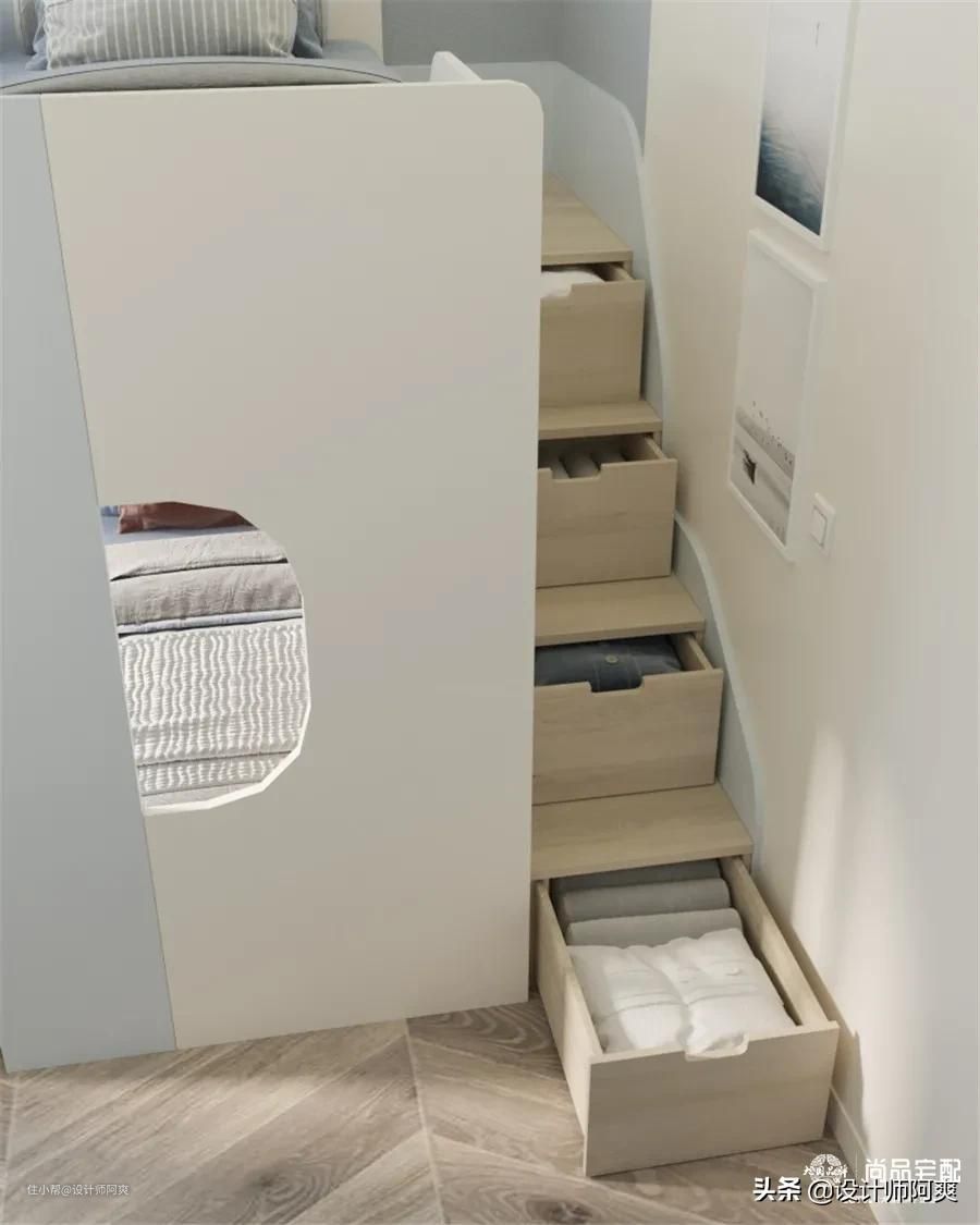 ▲狭长户型设计侧楼梯后储物床,充分利用后方空间,增加30%收纳空间,还能拥有个人专属小天地。