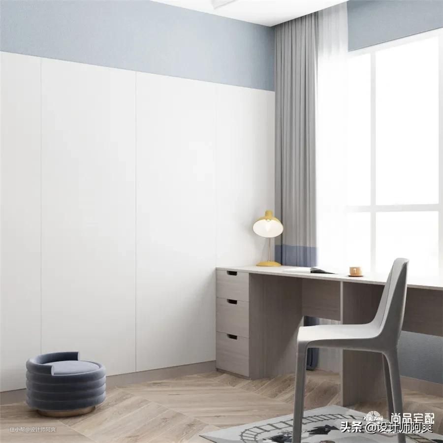 ▲上下床错位设计还腾出1㎡小型衣帽间,挂衣叠放组合收纳。书桌巧妙利用圆弧和床尾空间结合,增加储物空间。